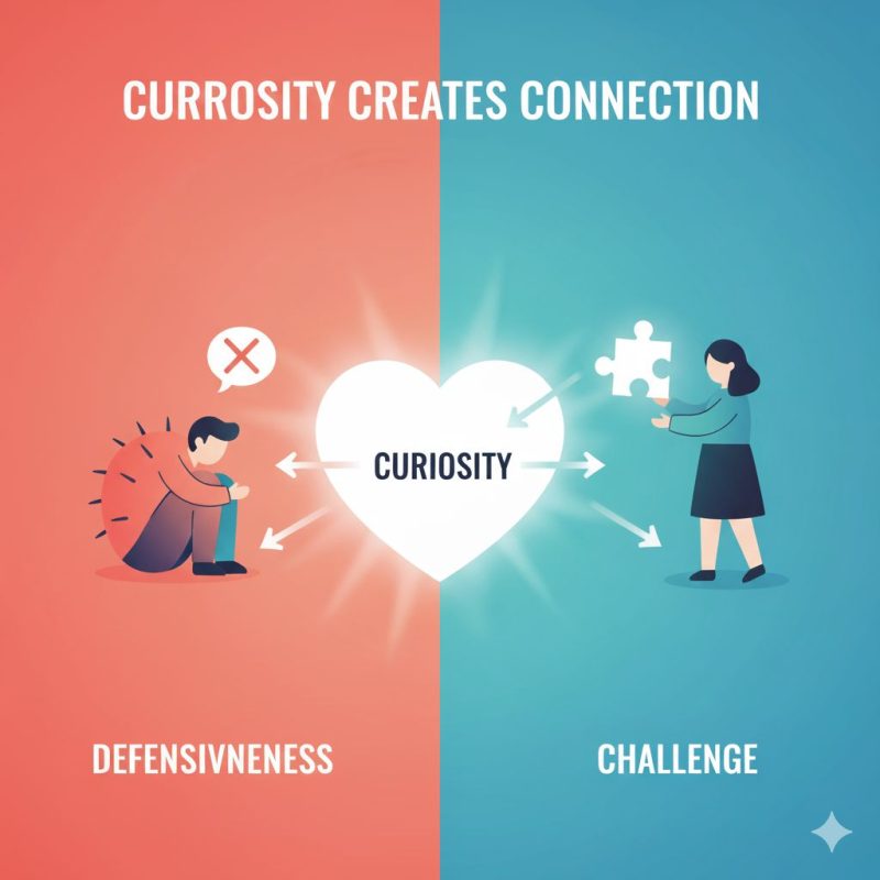 Next time she challenges you, remember this simple formula: Defensiveness shrinks the relationship; Curiosity expands it.